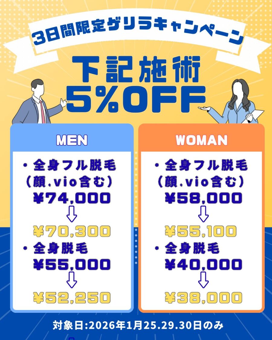 全身フル脱毛(顔.VIO有)、全身脱毛(顔.VIO無)がお得になるゲリラキャンペーンを開催いたします!